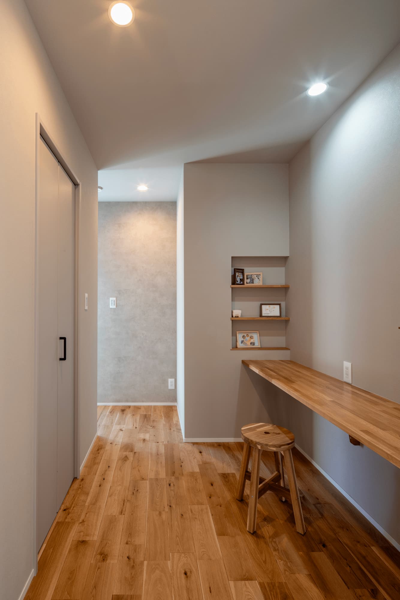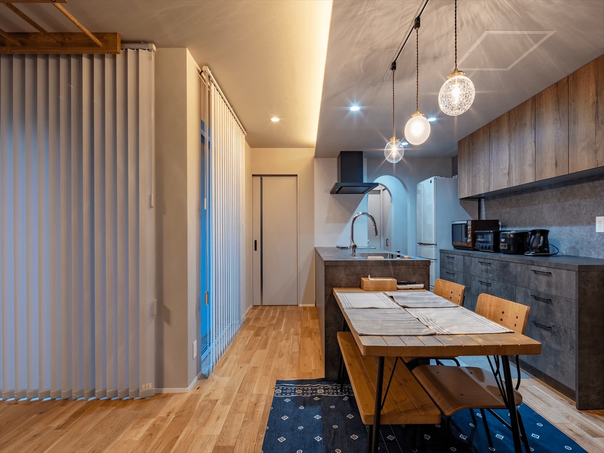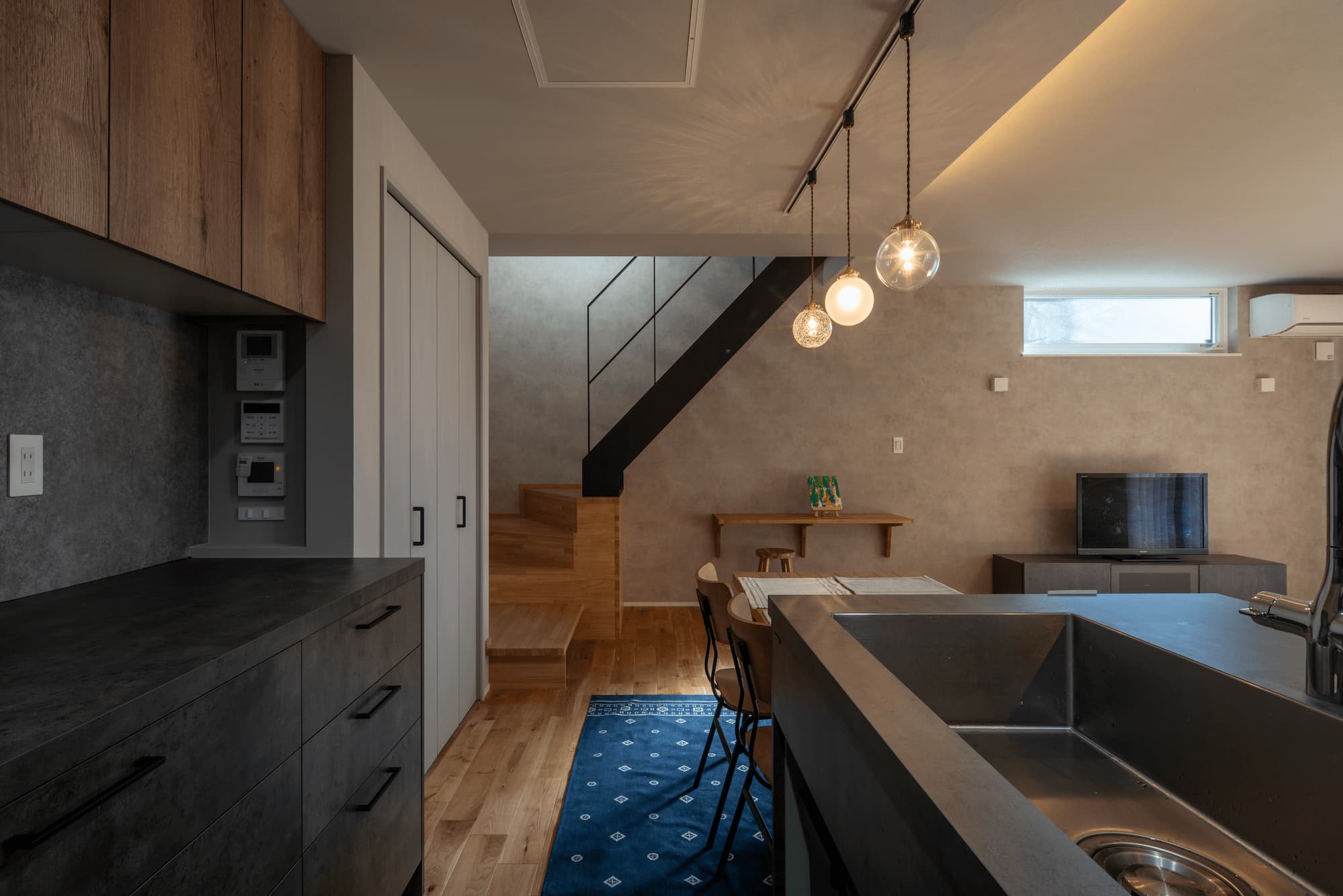 ペニンシュラキッチンからパントリー、横並びのダイニングテーブルは家事動線が最短で機能的。
