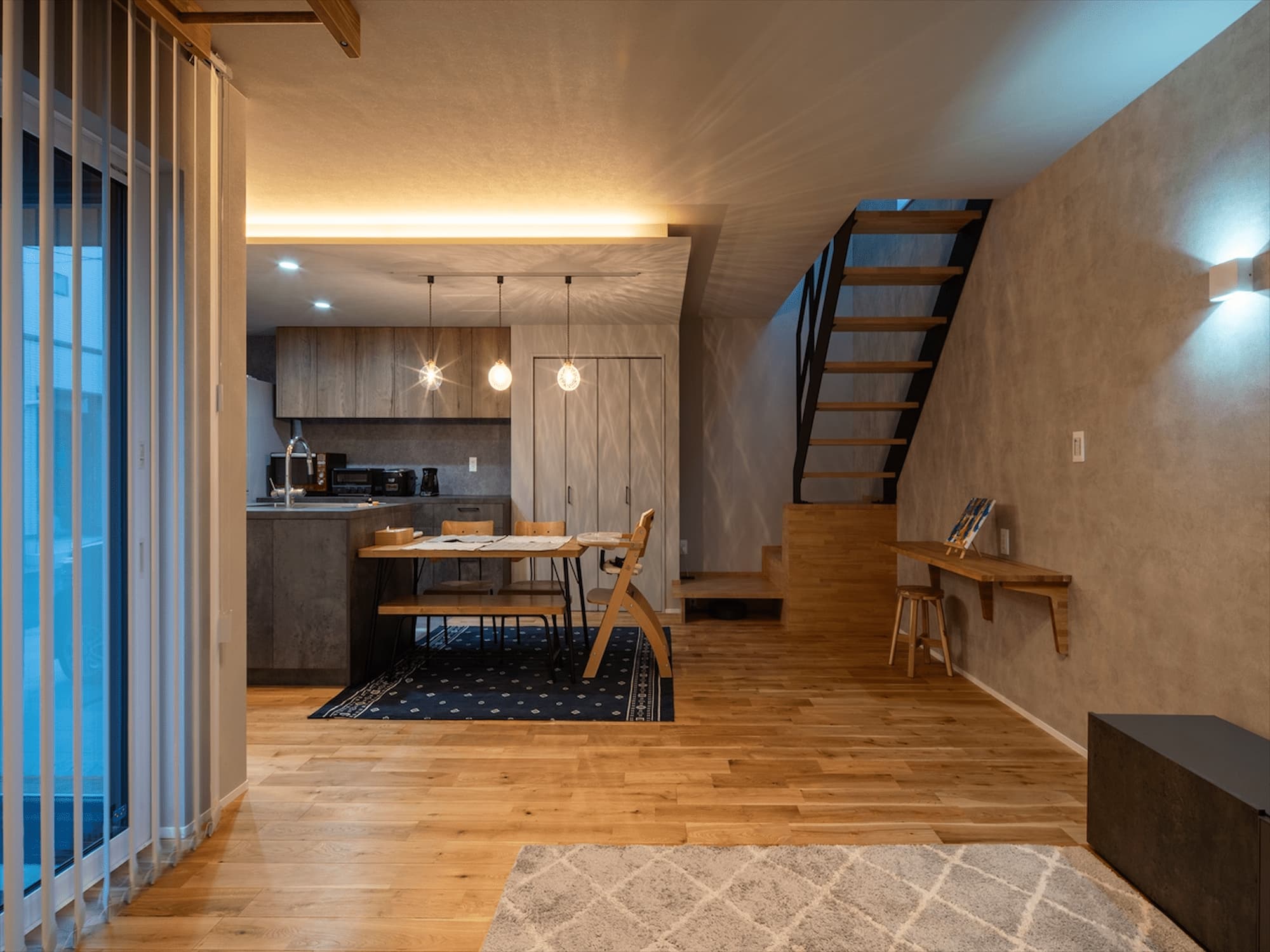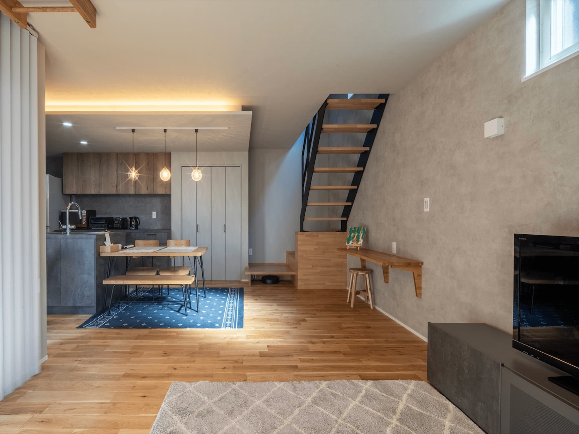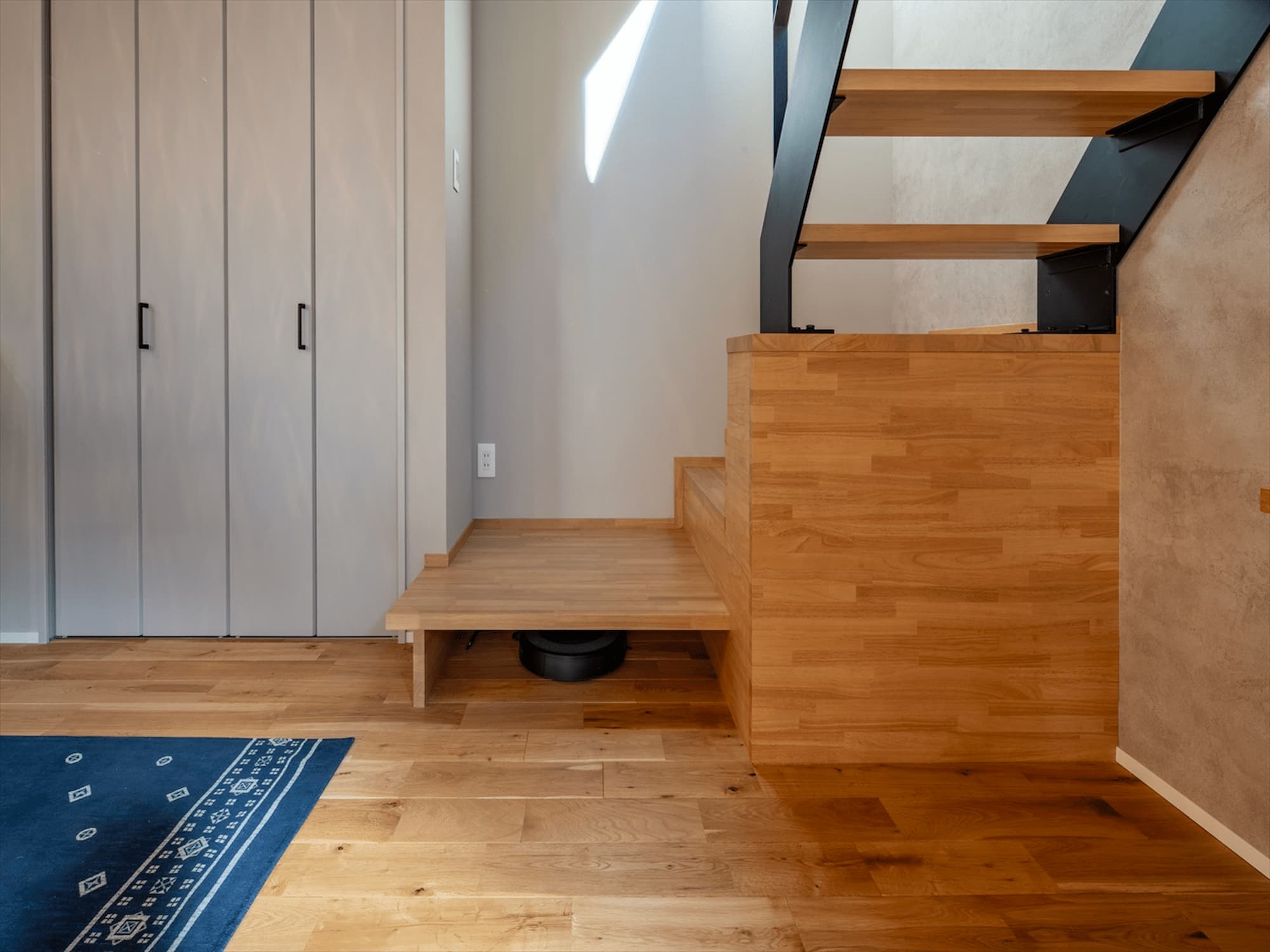 リビングにある雲梯や階段のルンバ基地と大人心くすぐる仕掛けが満載のおうち。