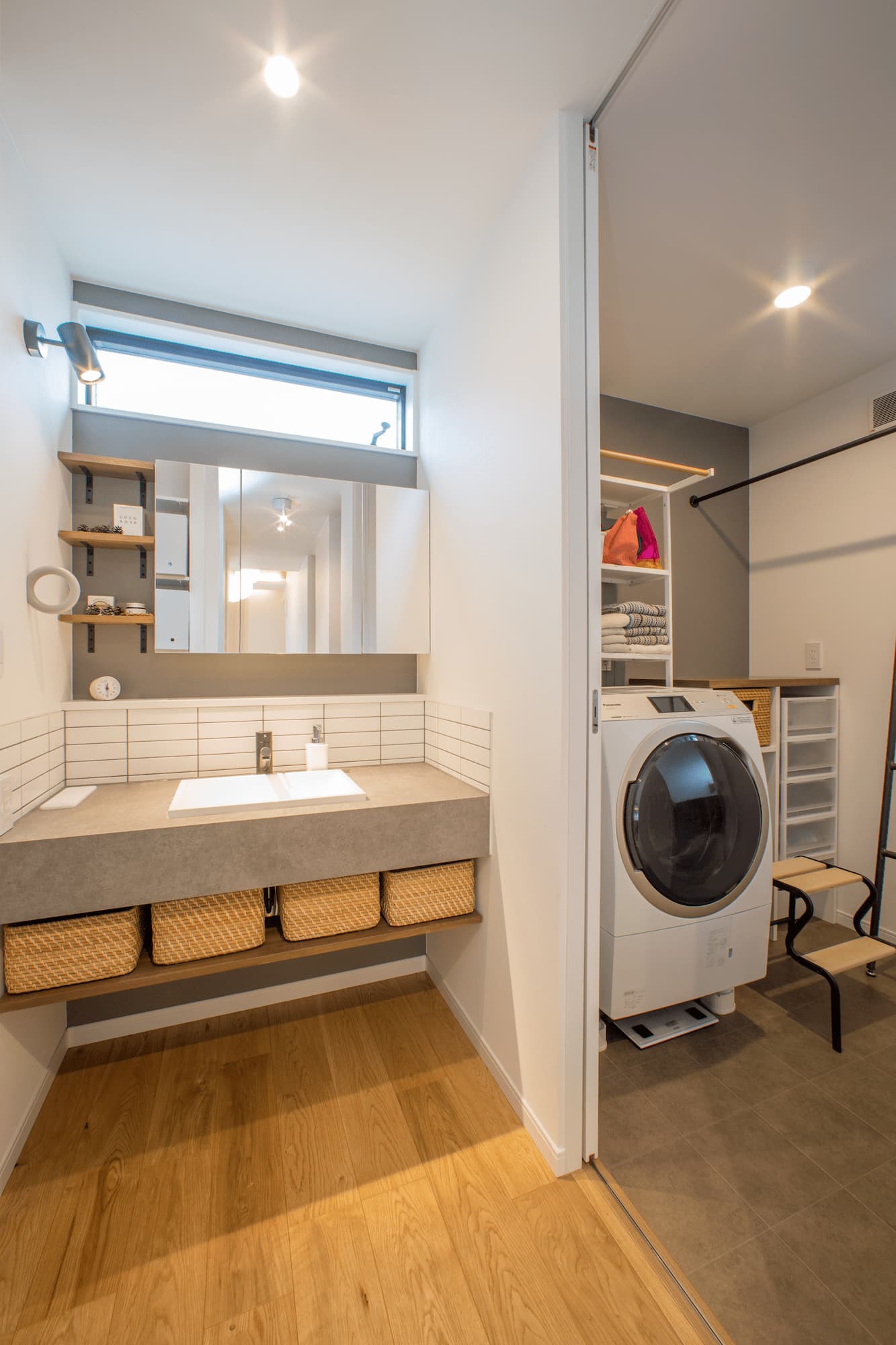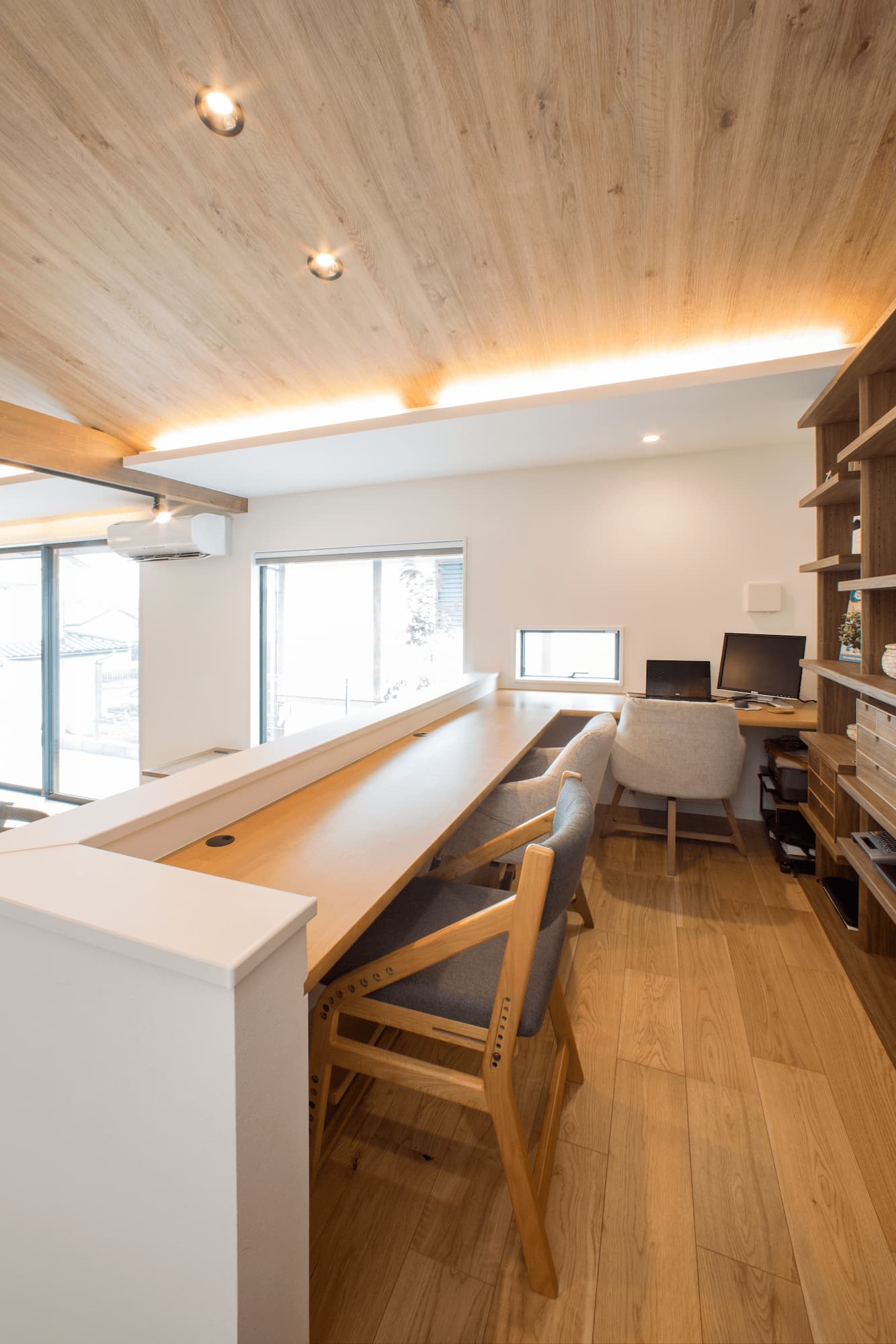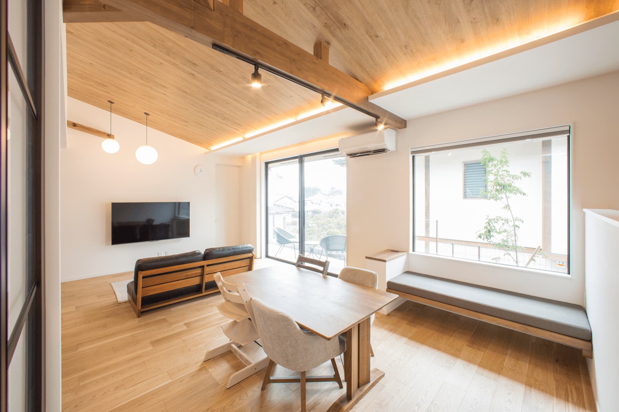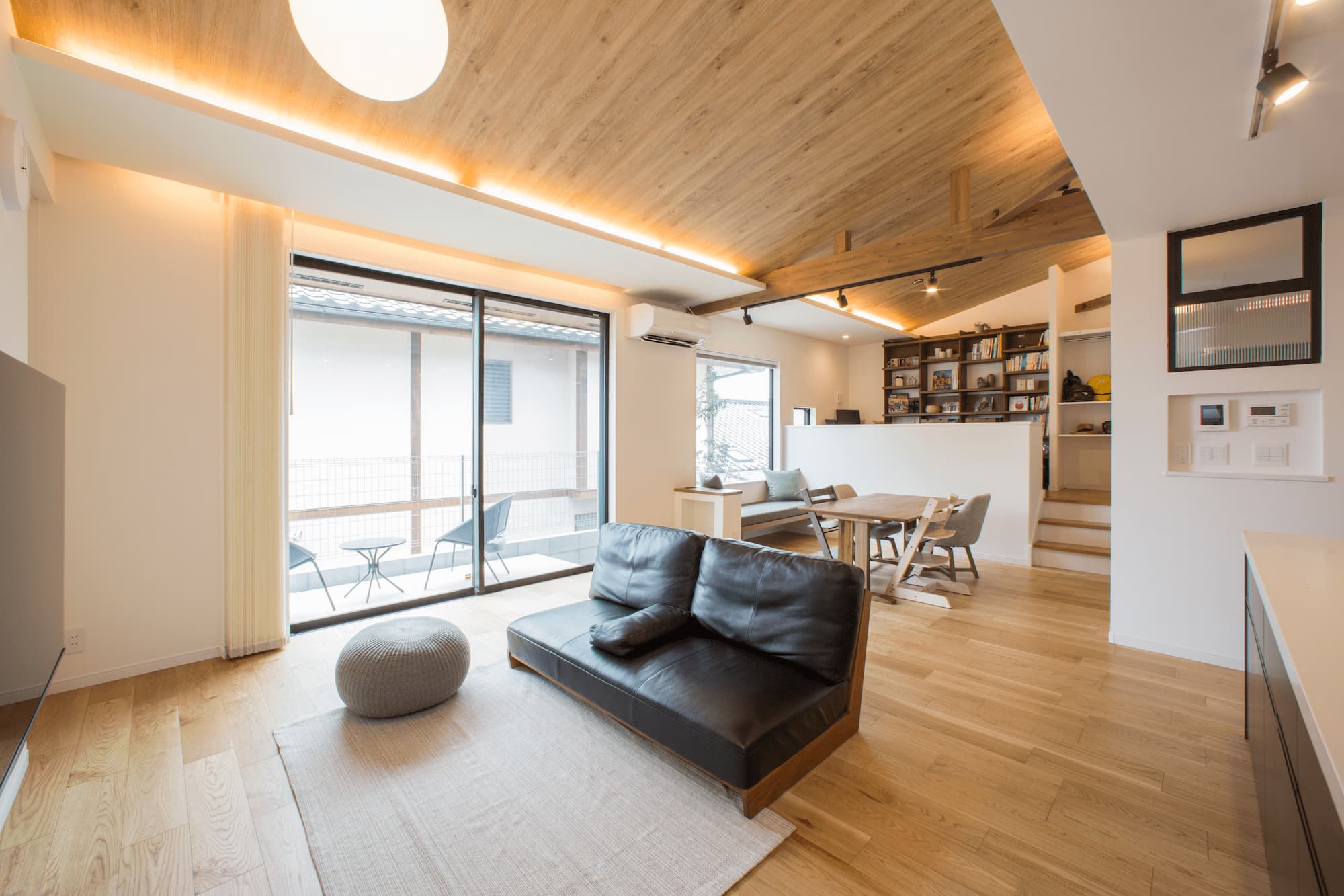 明るいリビングは勾配天井で広々。スキップフロアではお子様の学習スペースとしても、