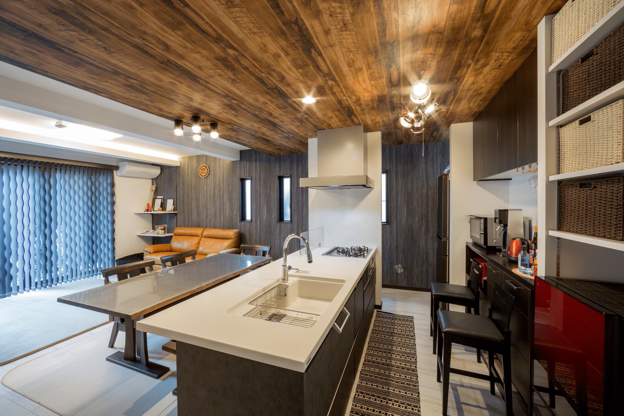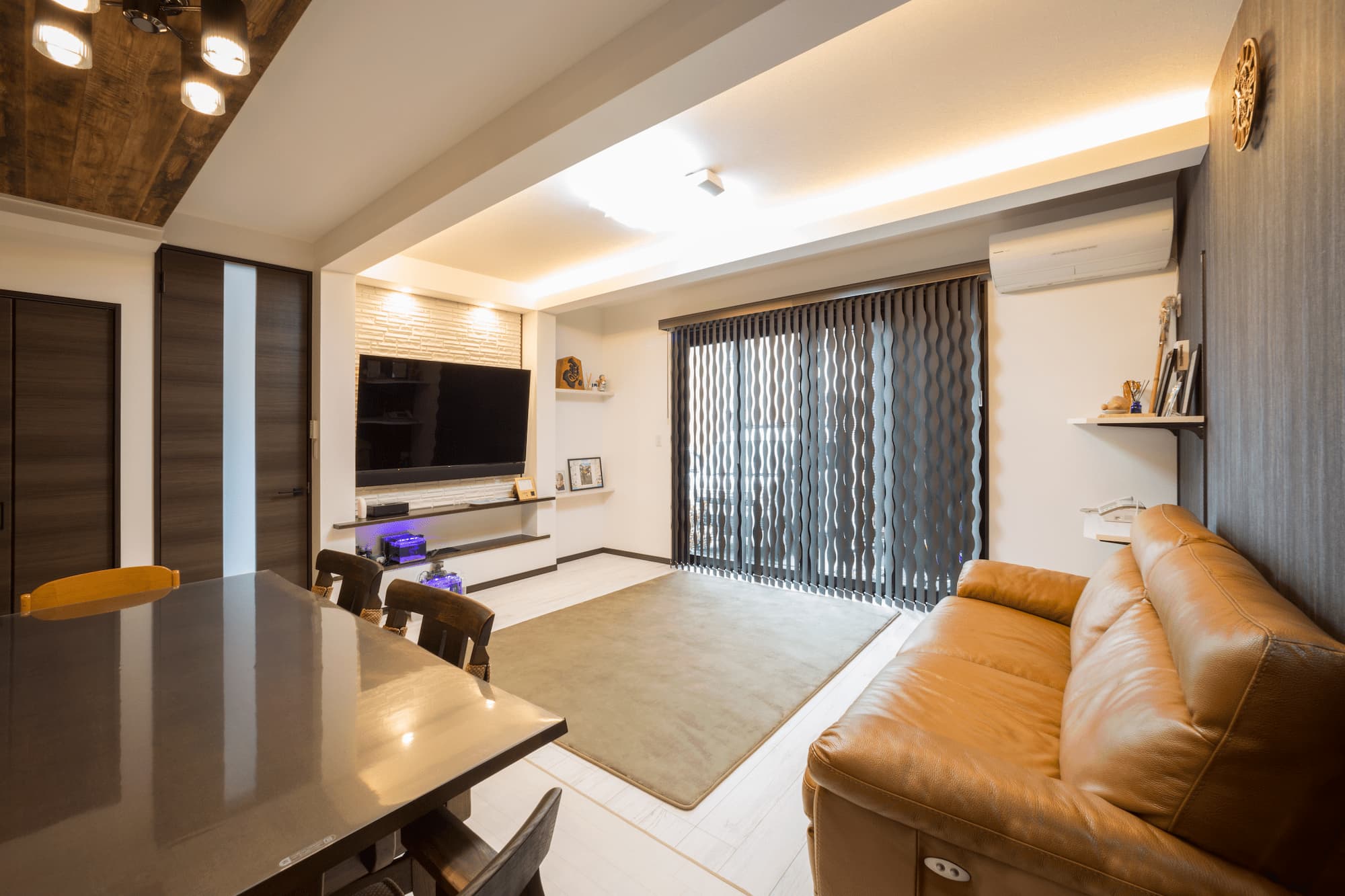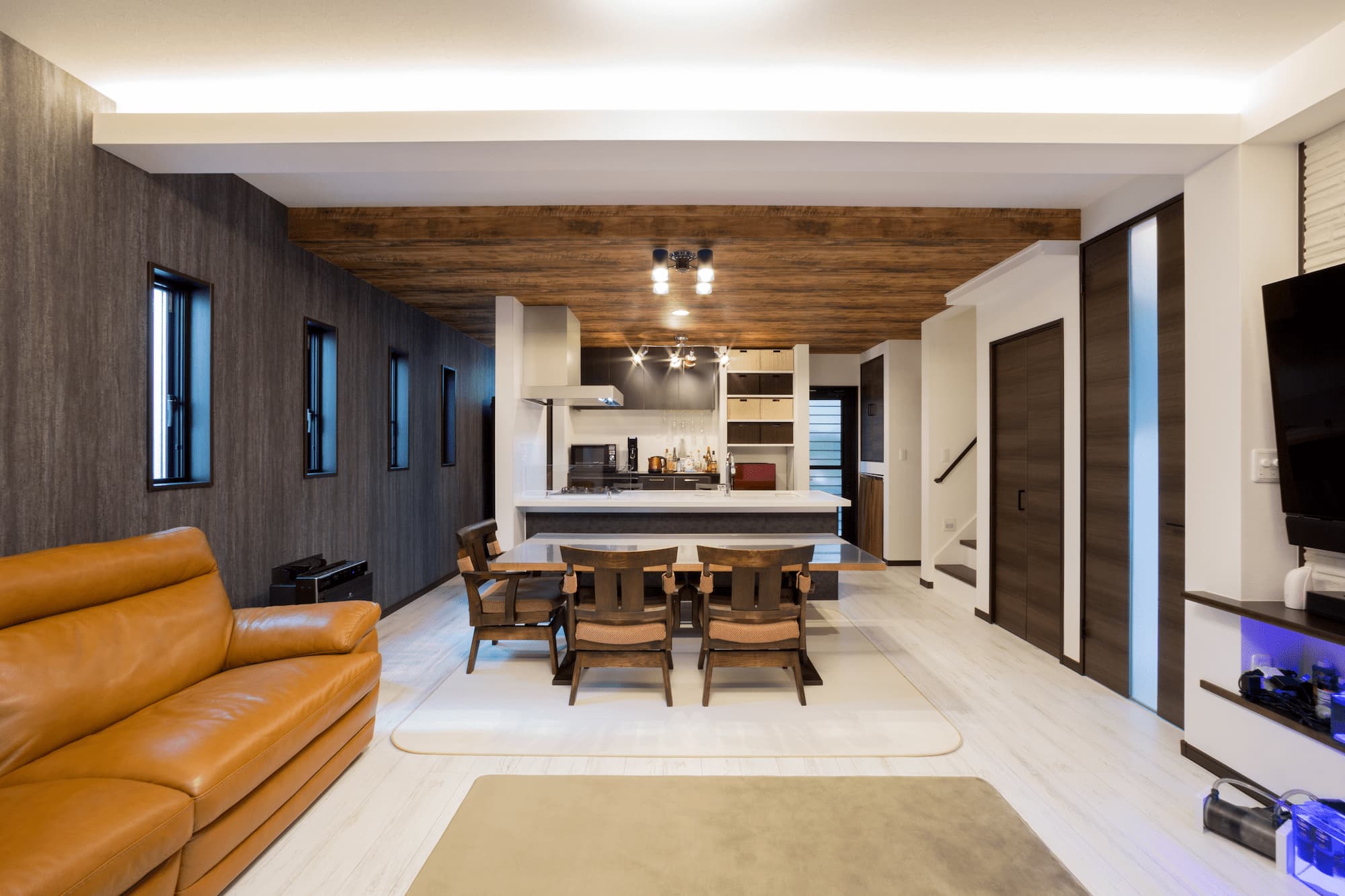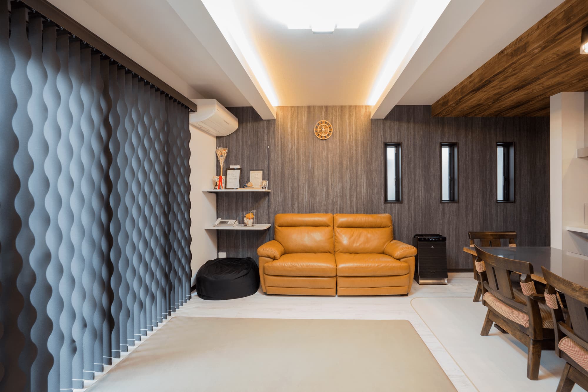 3世代で生活する2世帯住宅プラン。木の雰囲気と照明にもこだわりをもち、間接照明がリビングに気品と豪華さを与えます。