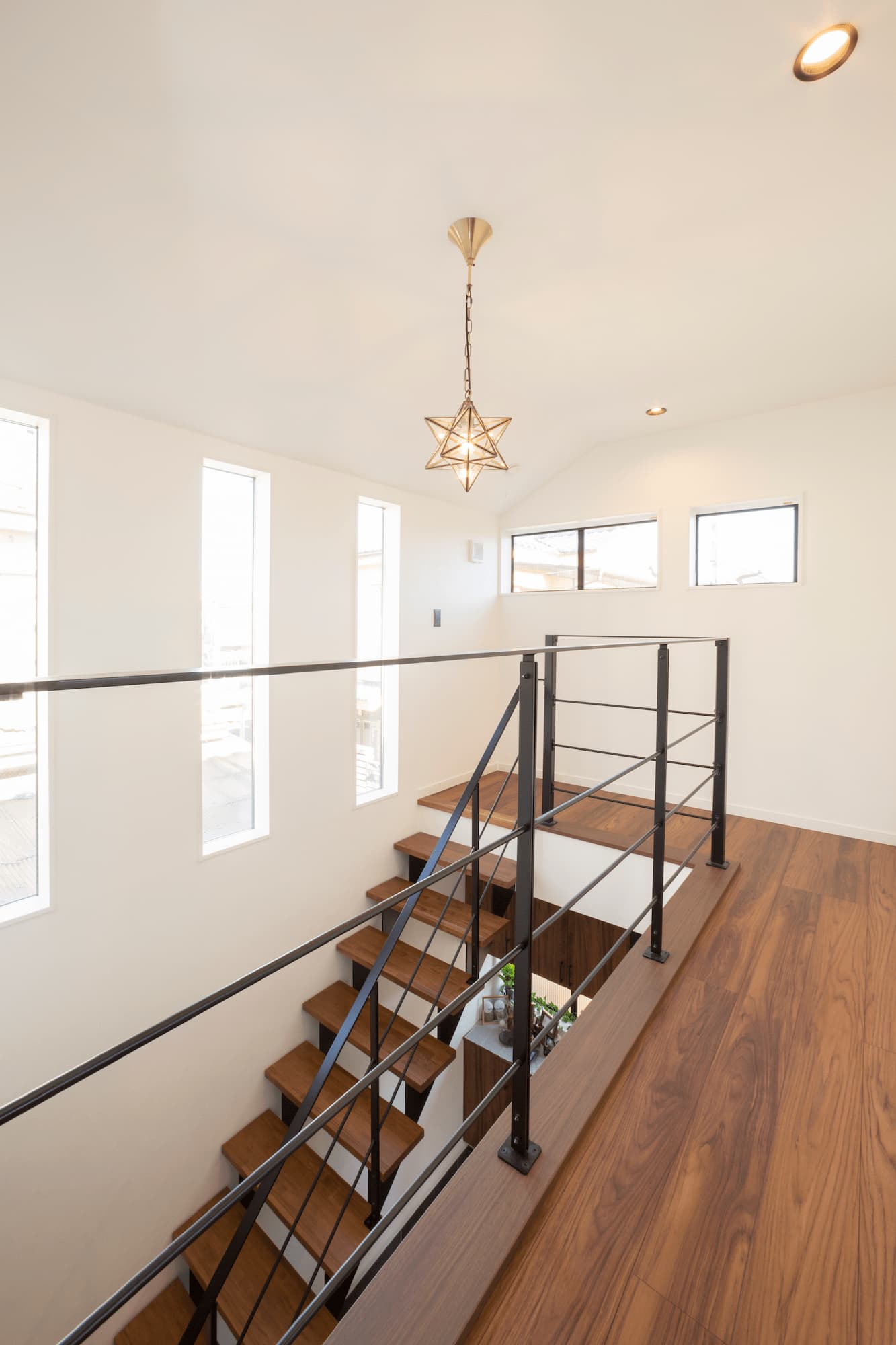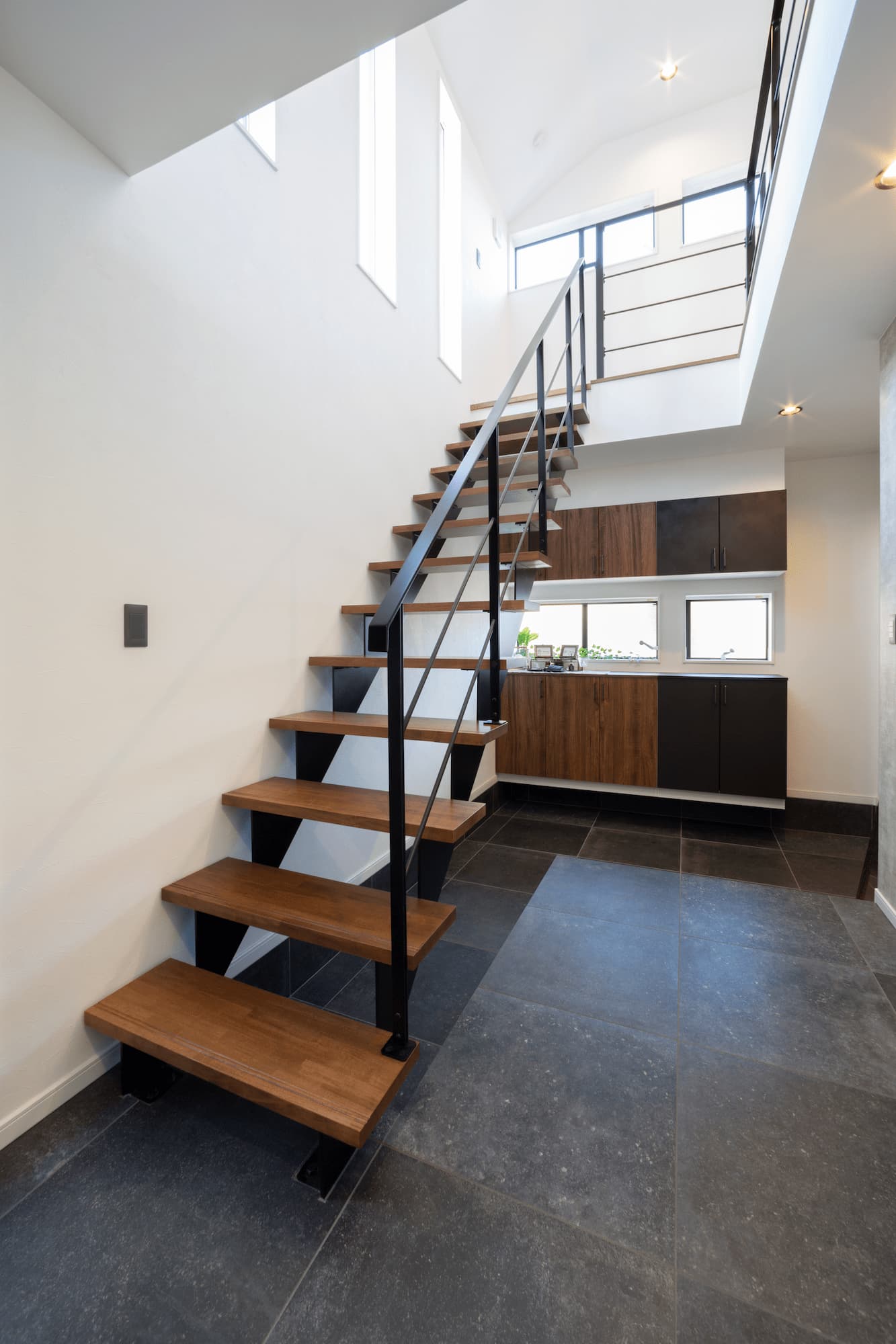 吹抜の広々とした玄関にアイアン階段を設置。