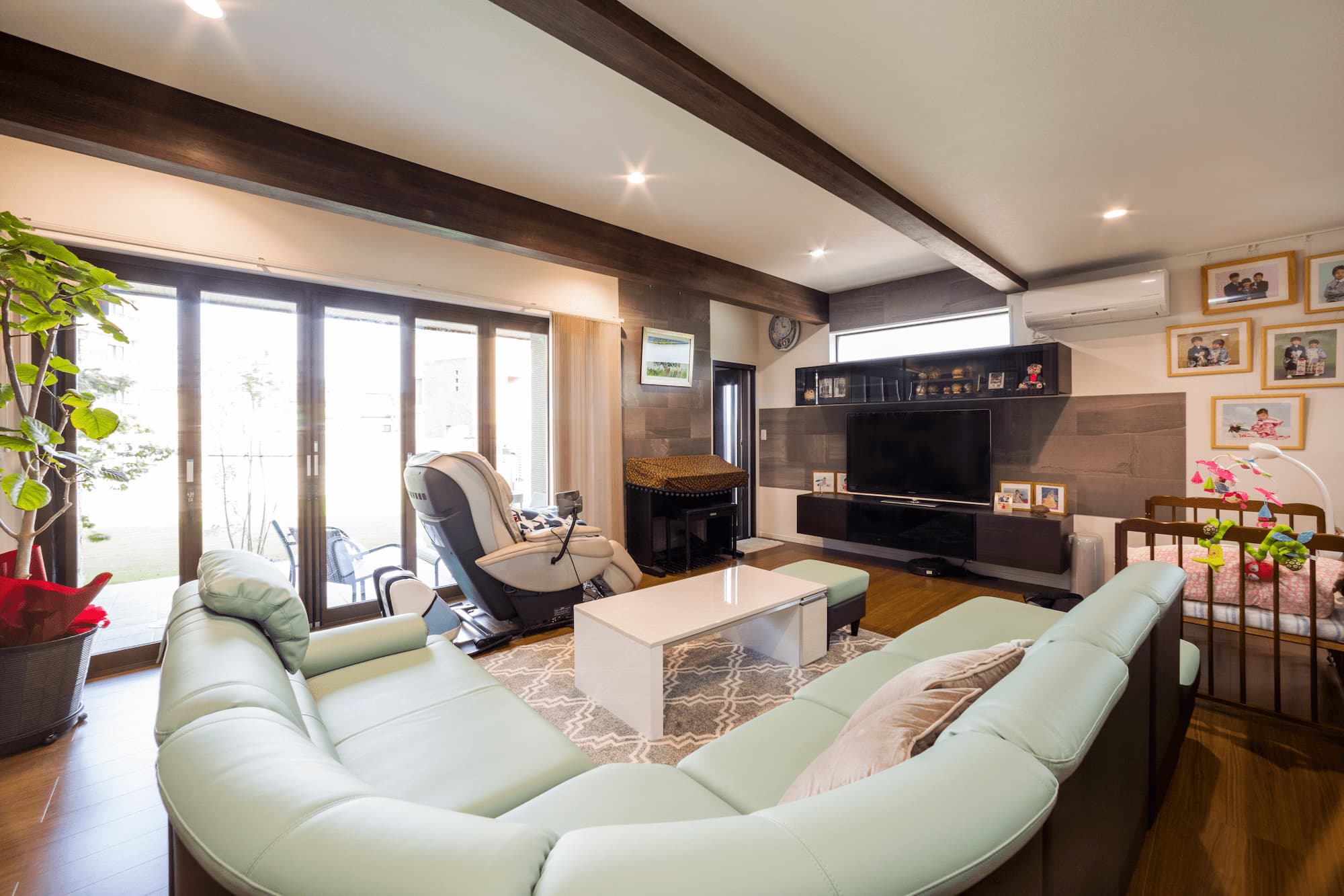 リビングから大きな窓を開けると、テラスデッキとドッグランで使用する芝生が緑豊かに演出しています。