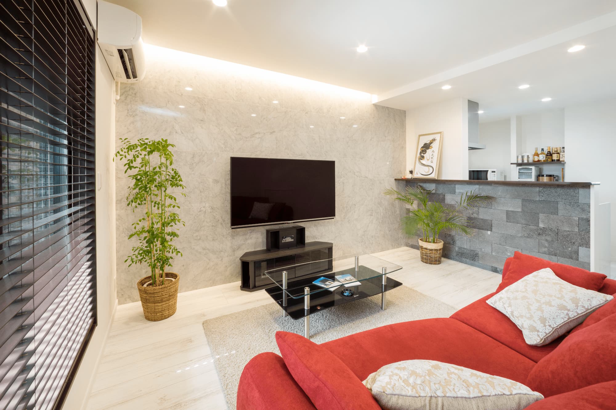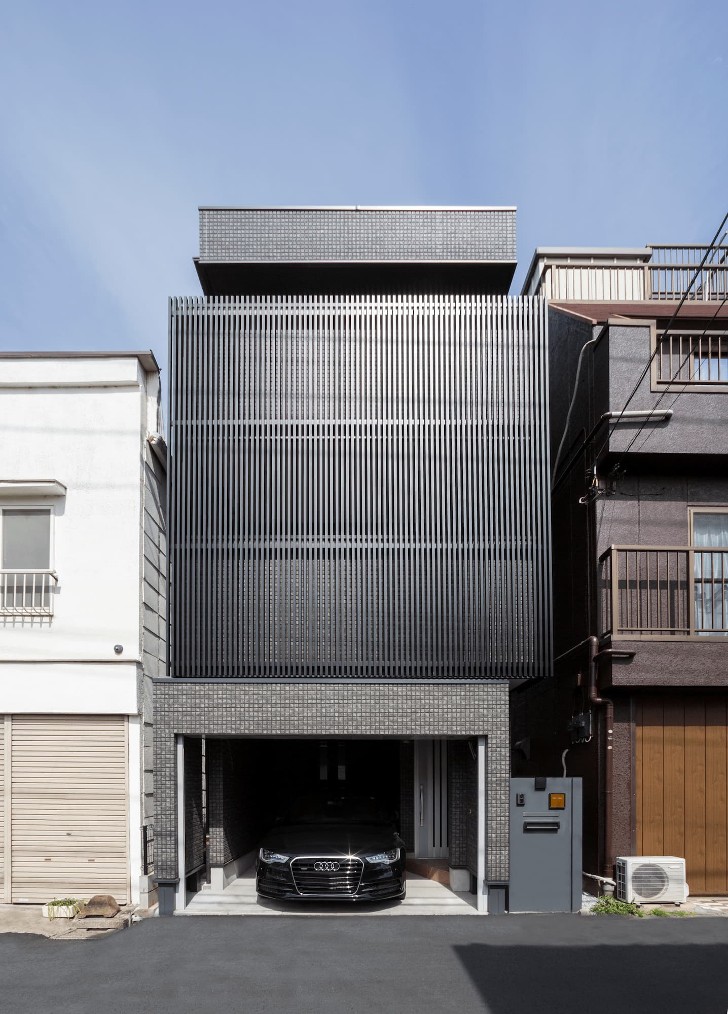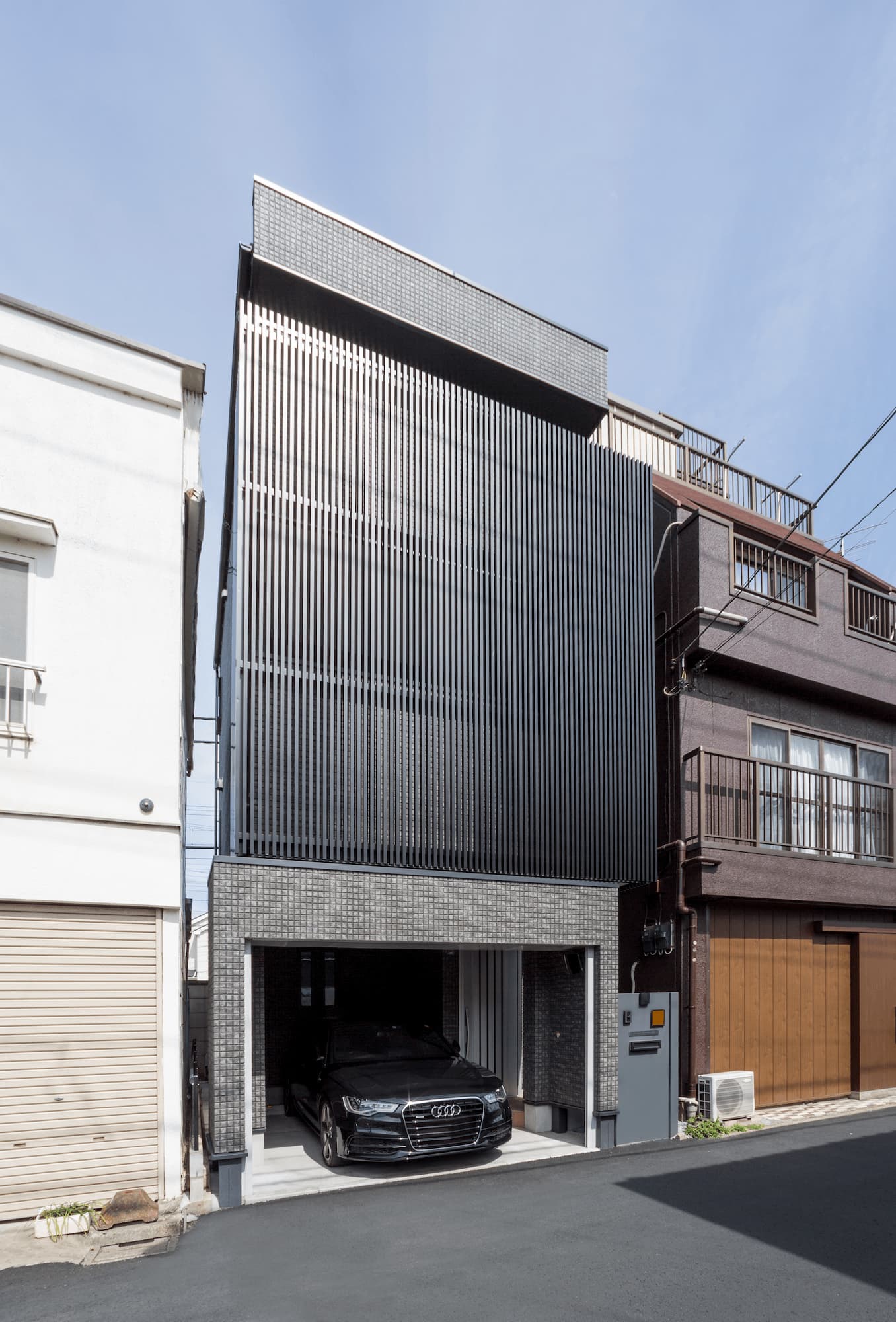 都市に立つ住宅は、プライベートの空間が持ちにくい現状を格子のデザインで、外からの視界を遮りながらも、室内には光と風がしっかりと入るような空間。