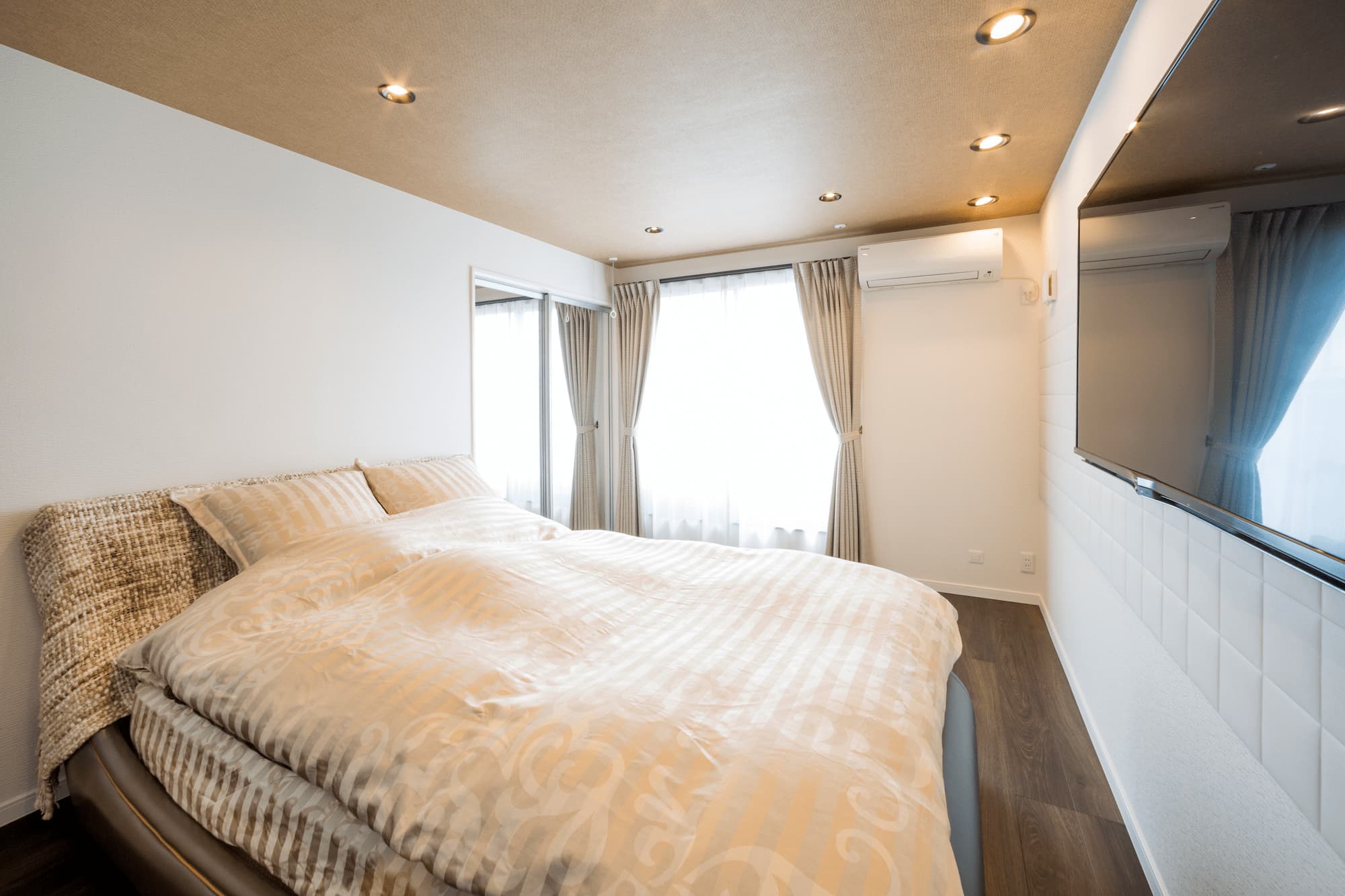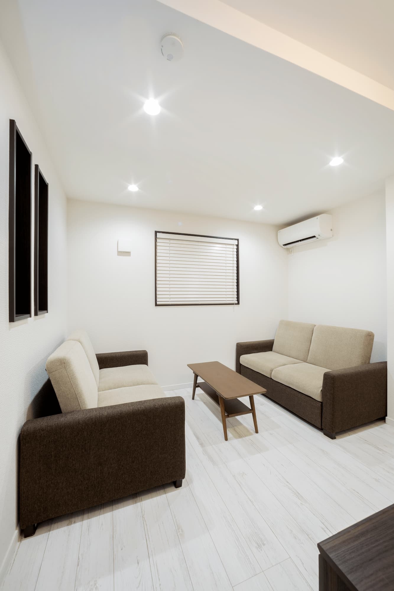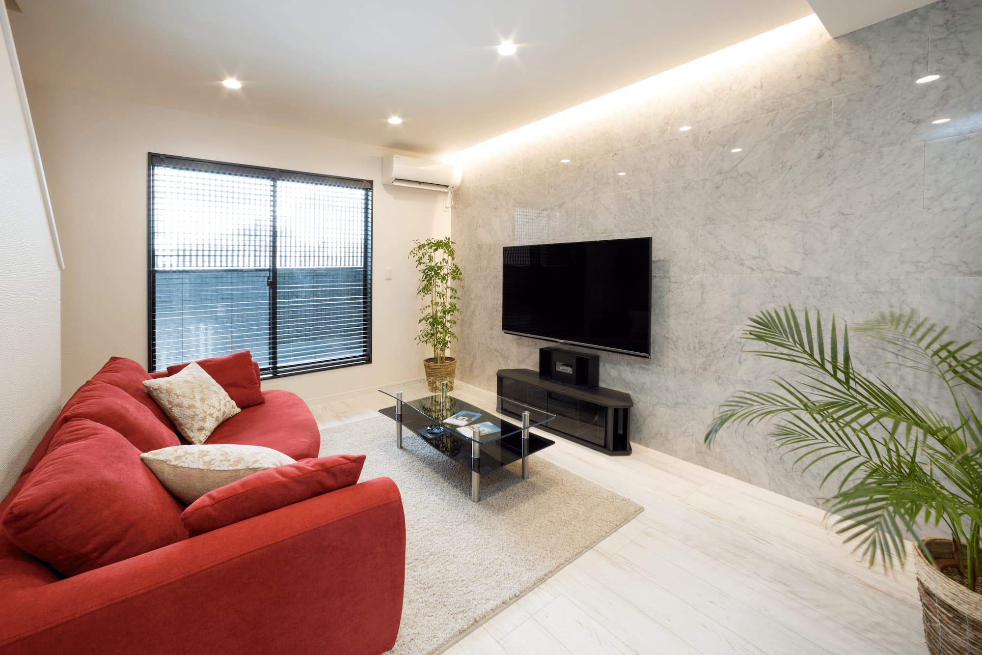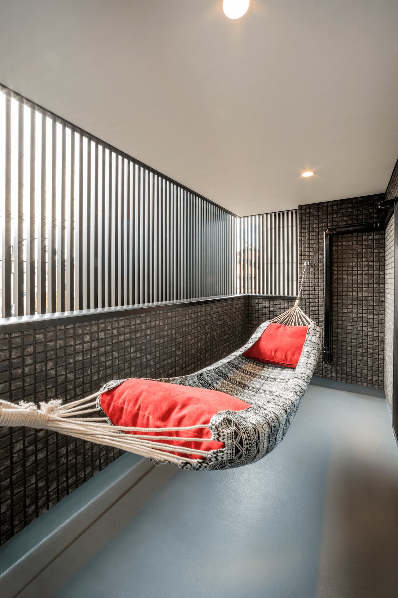 都市に立つ住宅は、プライベートの空間が持ちにくい現状を格子のデザインで、外からの視界を遮りながらも、室内には光と風がしっかりと入るような空間。